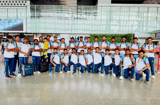 The Bengal Under-23 men’s team members pose at the Netaji Subhash Chandra Bose International Airport, Kolkata on Monday before departing for Guwahati to participate in the Col C K Nayudu Trophy Elite which begins on October 16, Thursday. The Shashank Singh-led Bengal team will take on Assam in their opening match at the ACA Cricket Academy Ground, Fulung, North Guwahati.